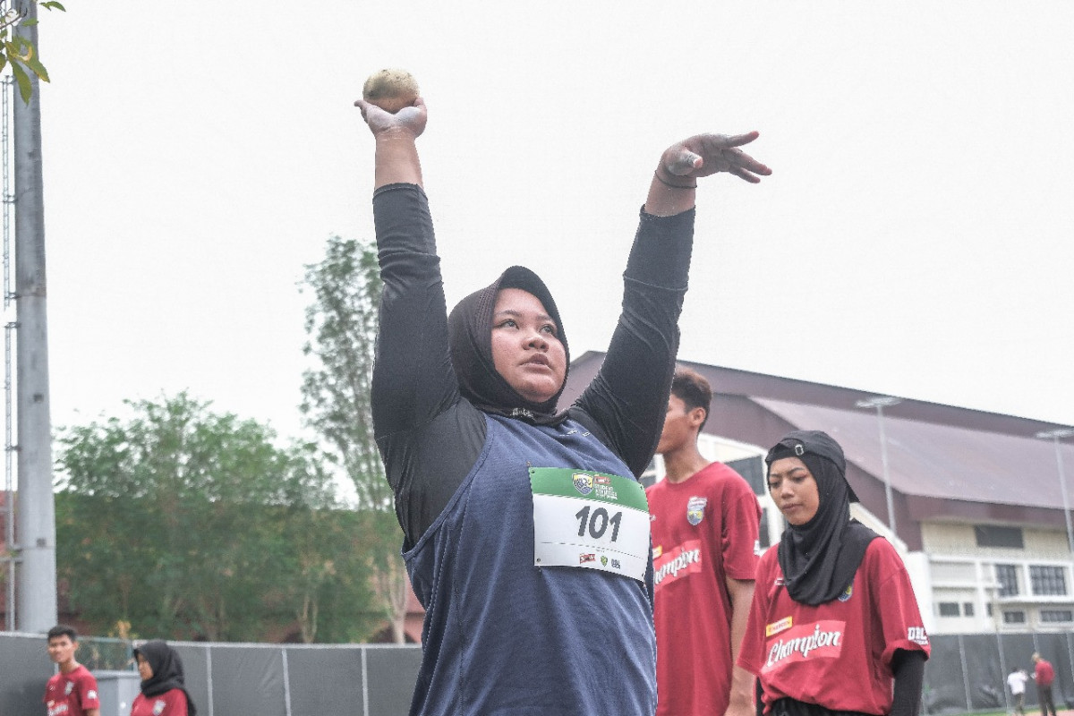 Indi Oktavia asal SMA Negeri 3 Ponorogo kembali naik podium di nomor perlombaan tolak peluru Energen Champion SAC Indonesia 2023 East Java Qualifiers, Sabtu, 9 Desember 2023.