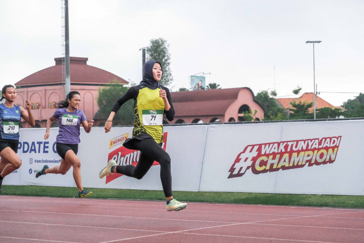 Tercepat. Siswi MAN Lumajang, Dwi Ajeng Hening Mangesti menjadi pelari tercepat plus pemenang nomor lomba sprint 100 meter sektor putri Energen Champion SAC Indonesia 2023 East Java Qualifiers.