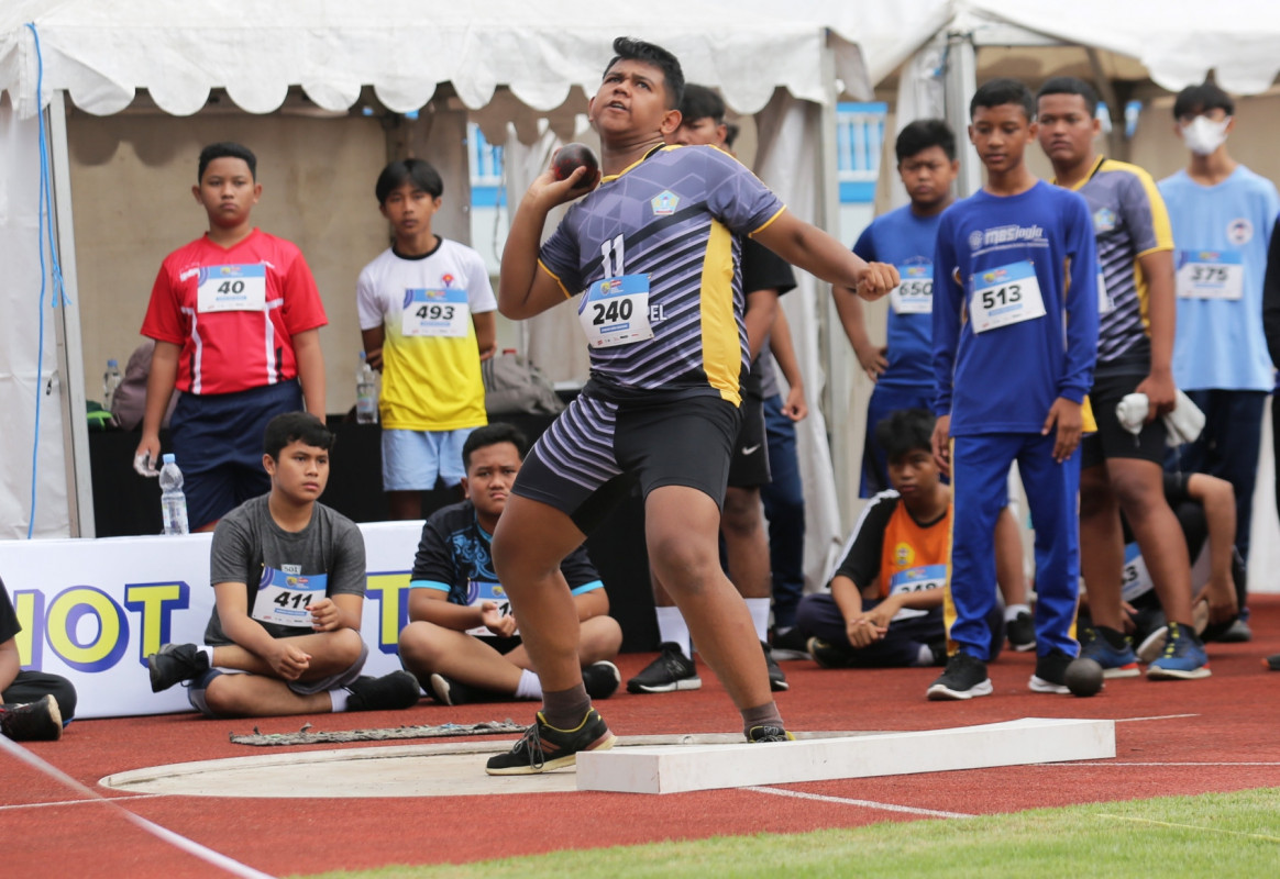 Masraka Raihan (SMPN 2 Tempel) menjadi pemenang di nomor tolak peluru putra