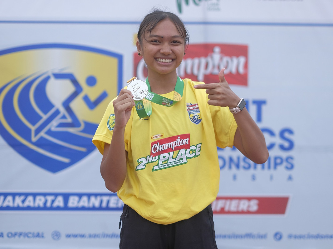Siswi SMAN 3 Rangkas Bitung ini menempati urutan kedua di podium Energen Champion SAC Indonesia 2023 Jakarta Banten Qualifiers dengan catatan waktu 13,30 detik. Raihan ini ia dapatkan berkat proses latihan disiplin yang ia lakukan.