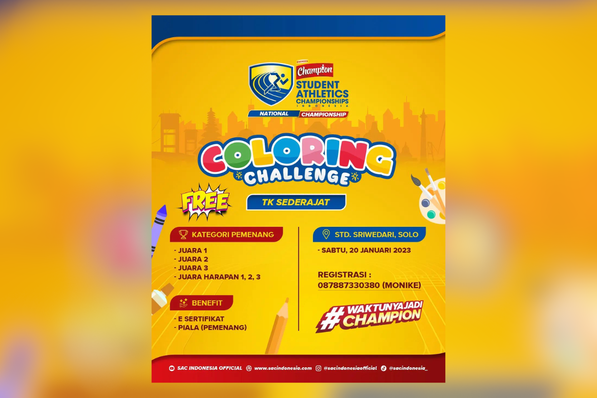Energen Champion SAC Indonesia 2023 National Championship punya serangkaian supporting event seru. Salah satunya adalah lomba mewarnai (coloring challenge) bagi anak-anak TK/Sederajat. Perlombaan ini juga akan diselenggarakan di Stadion Sriwedari, Solo, Jawa Tengah, pada Sabtu, 20 Januari 2023.