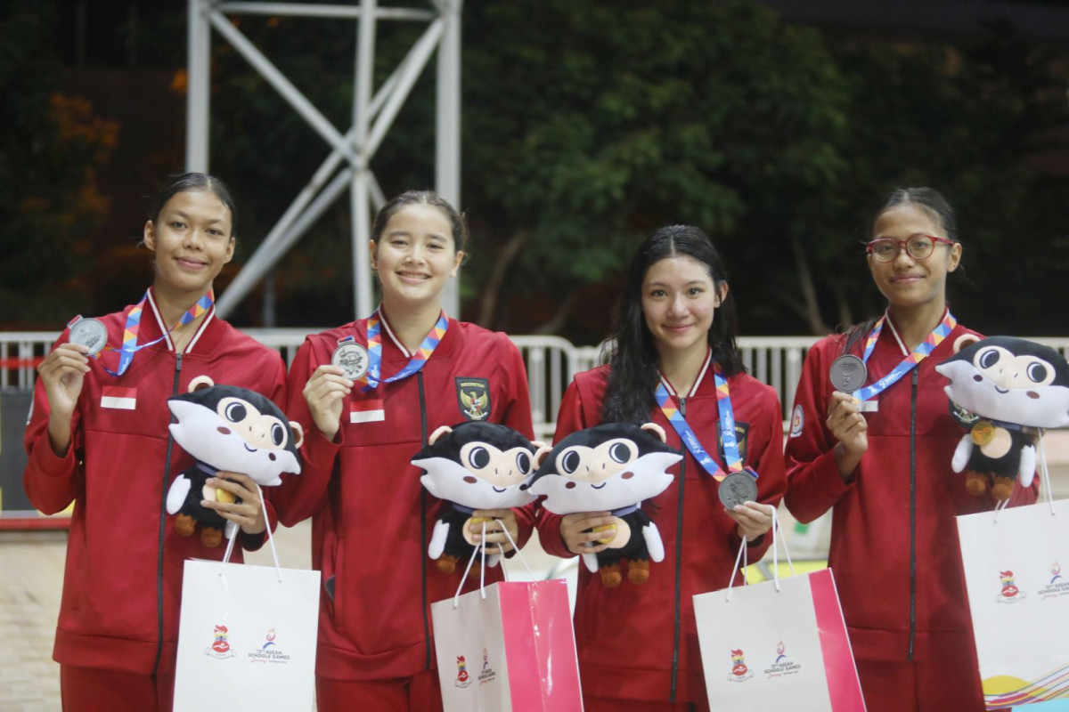Nadia Aisha Nurazmi bersama dengan Megan Charlize, Lilly Kartina, dan Adelia Chantika usai meraih gelar runner up dalam 13th ASEAN School Games (ASG) 2024 untuk Swimming 4x100m Freestyle Relay