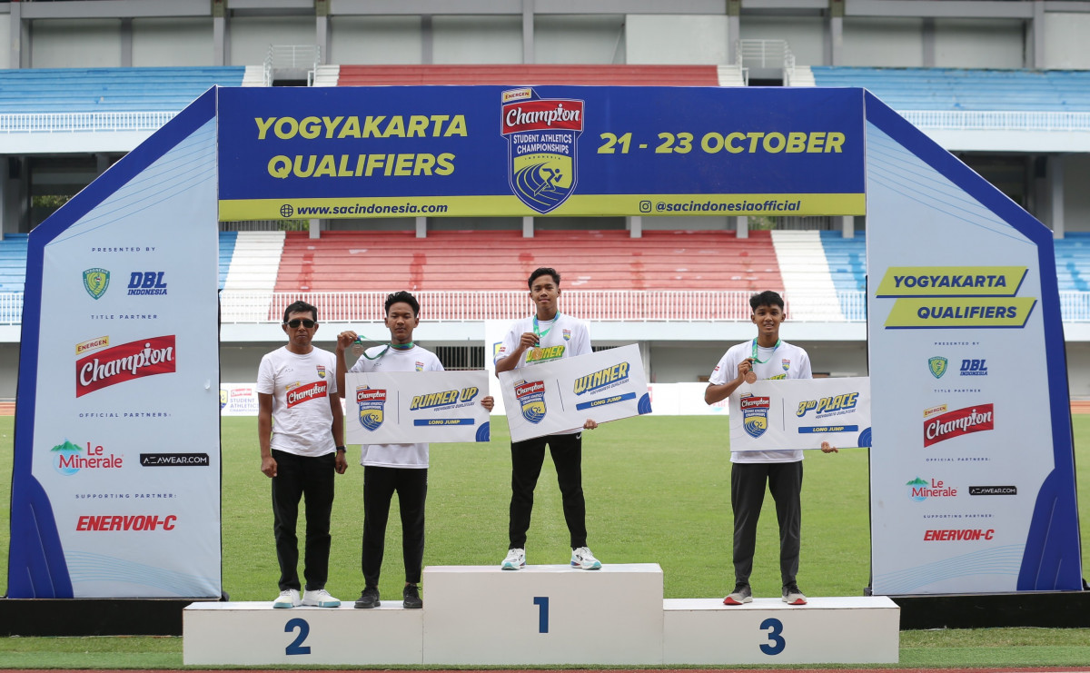 Khabib Ridwan (tengah) saat menerima penghargaan juara lompat jauh putra di Energen Champion SAC Indonesia - Yogyakarta Qualifiers