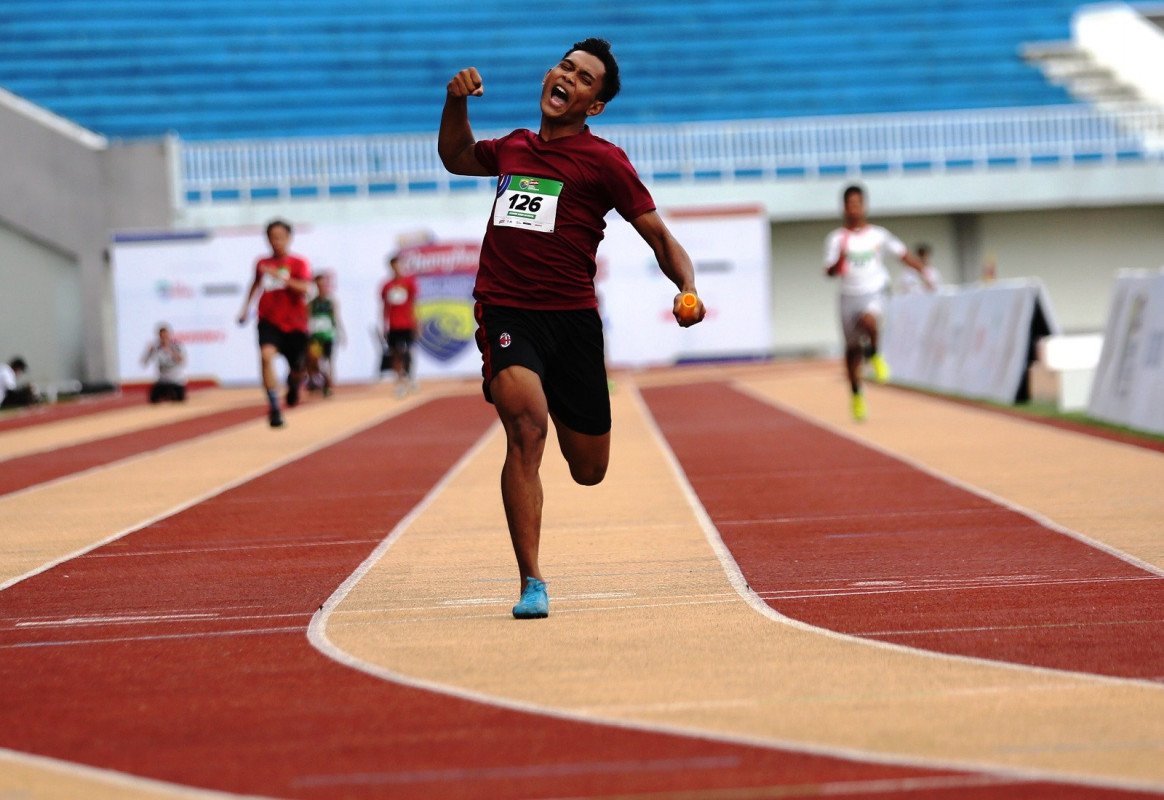 Selebrasi M. Azidan Pamungkas ketika finis pertama di final estafet 4x100 meter Energen Champion SAC Indonesia - Yogyakarta Qualifiers