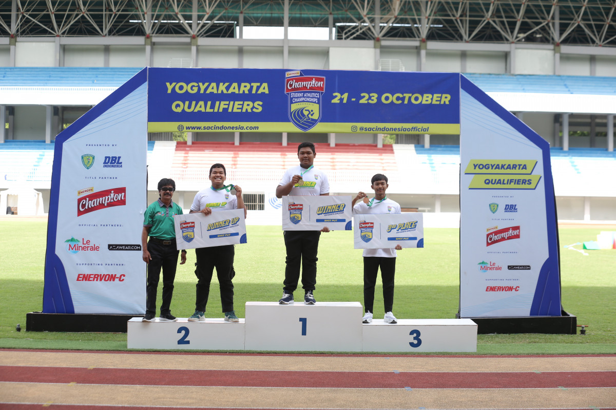 Rifqi Adi Saputra (tengah) saat menerima penghargaan sebagai raja tolak peluru putra Energen Champion SAC Indonesia - Yogyakarta Qualifiers