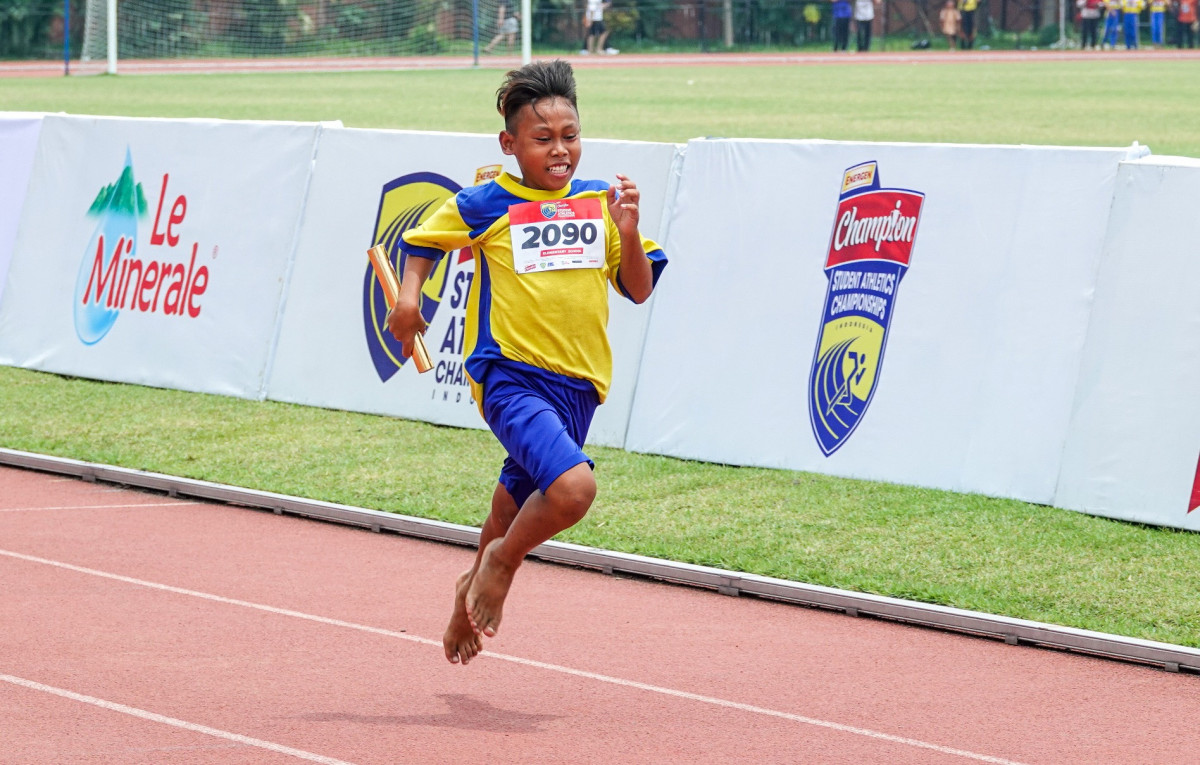 Akbar Widat Prasetyo dari SDN Siotopo Wetan V mendekati garis finis dalam lomba estafet 8x50 meter putra