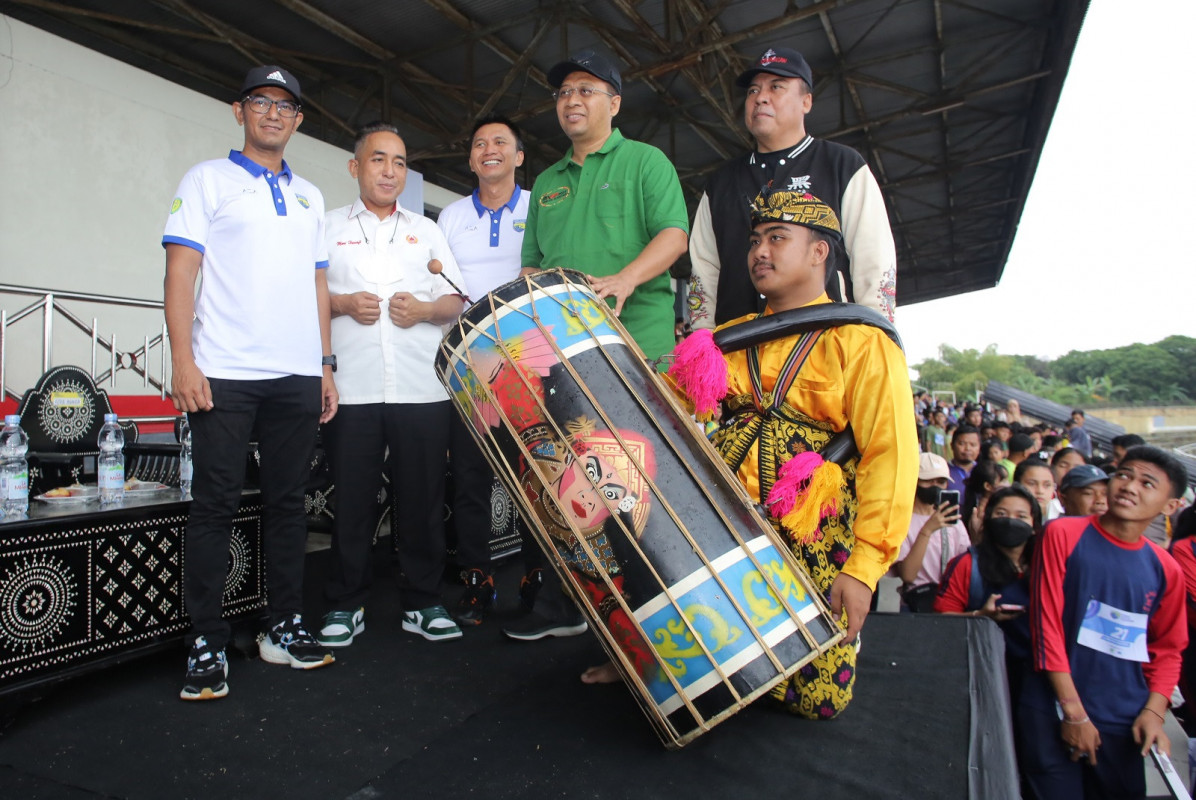 Gubernur NTB Zulkieflimansyah (baju hijau) bersama founder dan CEO DBL Indonesia Azrul Ananda (tiga dari kiri), Ketua KONI NTB Mori Hanafi (dua dari kiri), Kadispora NTB Surya Bahari (kanan) dan Ketua Pengprov PASI NTB Muhammad Farid Ghozaly (kiri) saat akan menabuh gendang beleq sebagai tanda dimulainya Champion SAC Indonesia qualifier Bali-Nusa Tenggara.
