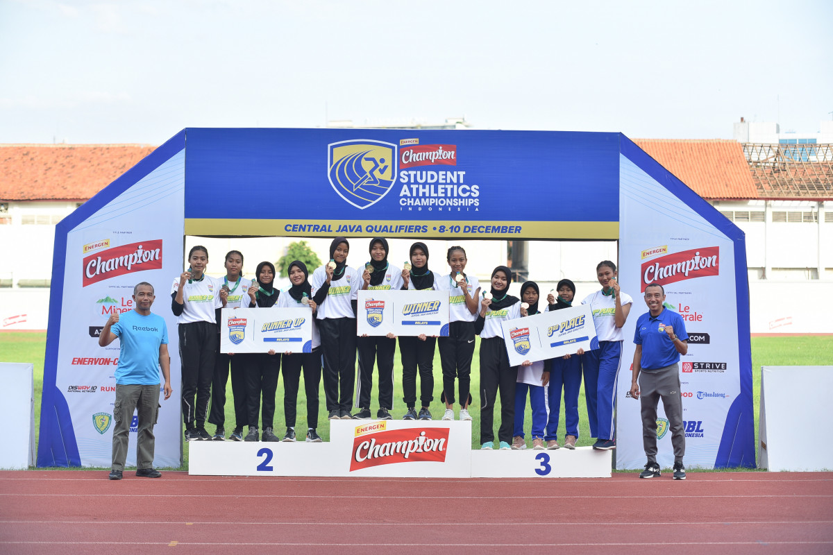Srikandi SMKN 1 Bawang (tengah) menjadi juara 4x100 meter putri di Central Java Qualifiers